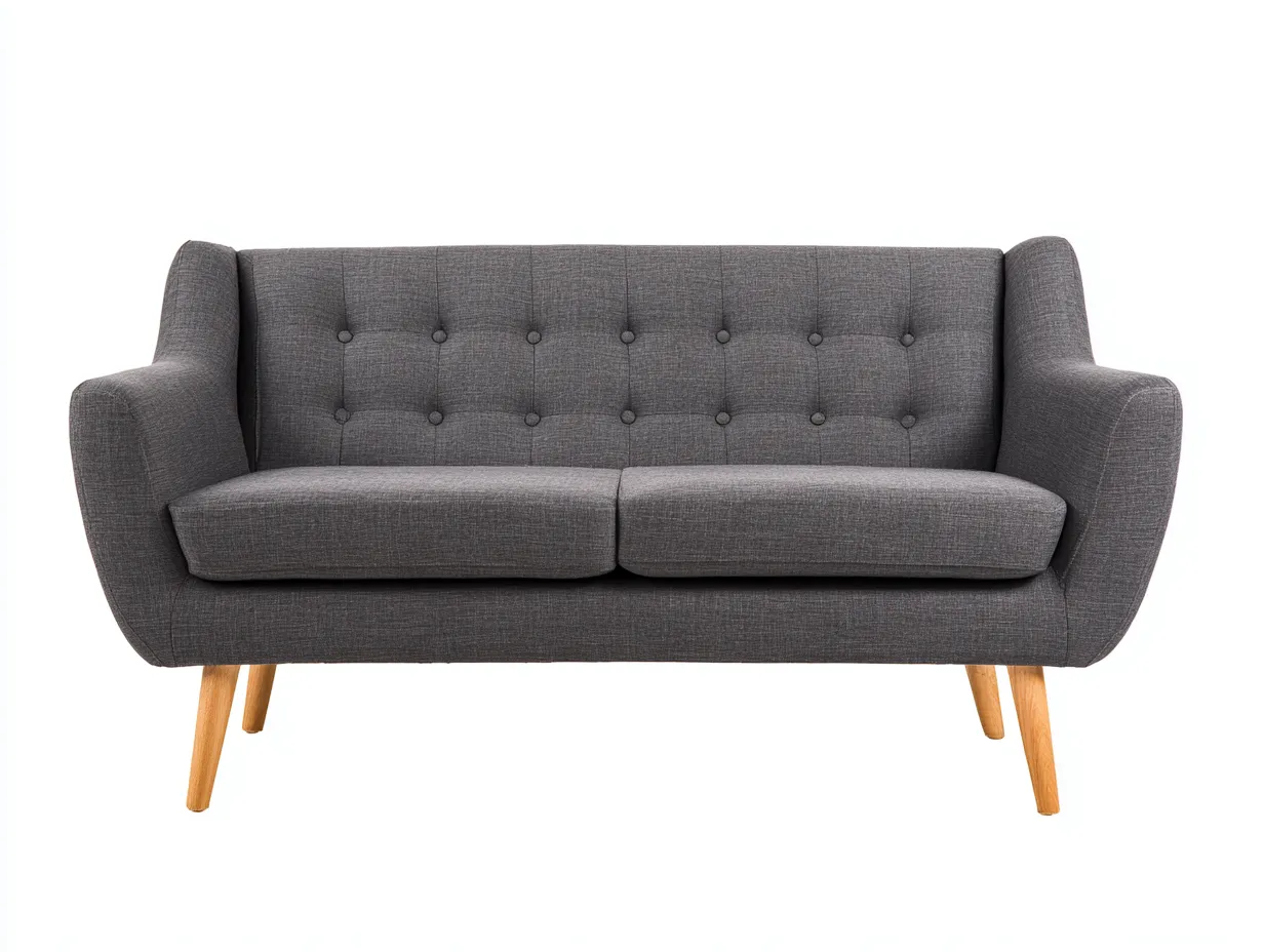 Sofá de 2 plazas 175 x 86 x 83 cm - tapizado gris oscuro y base de madera clara - estilo mid-century contemporáneo - con respaldo capitoné y apoyabrazos curvados