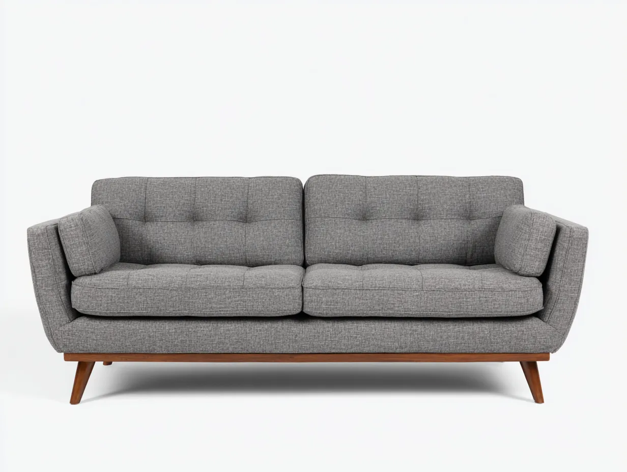 Sofá de 2 plazas 175 x 88 x 84 cm - tapizado gris y base de madera nogal - estilo mid-century contemporáneo - con cojines laterales y respaldo capitoné discreto