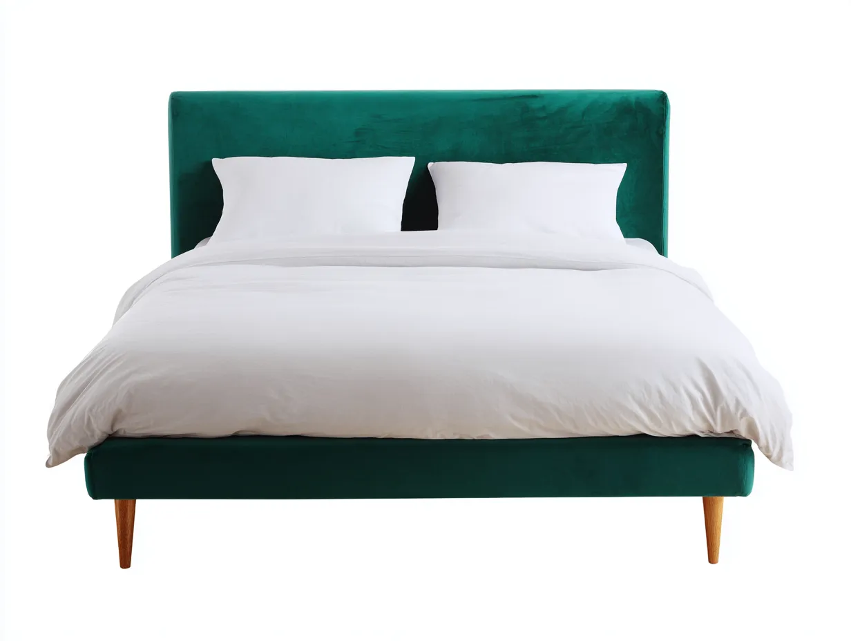 La estructura está revestida en terciopelo verde esmeralda, un material de tacto suave y acabado visual rico que realza la identidad del mueble. El cabecero y el marco presentan líneas limpias y una forma compacta que favorece una imagen ordenada. Las patas de madera clara aportan estabilidad, elevan visualmente la cama y añaden un contraste cálido que equilibra la intensidad del tapizado.