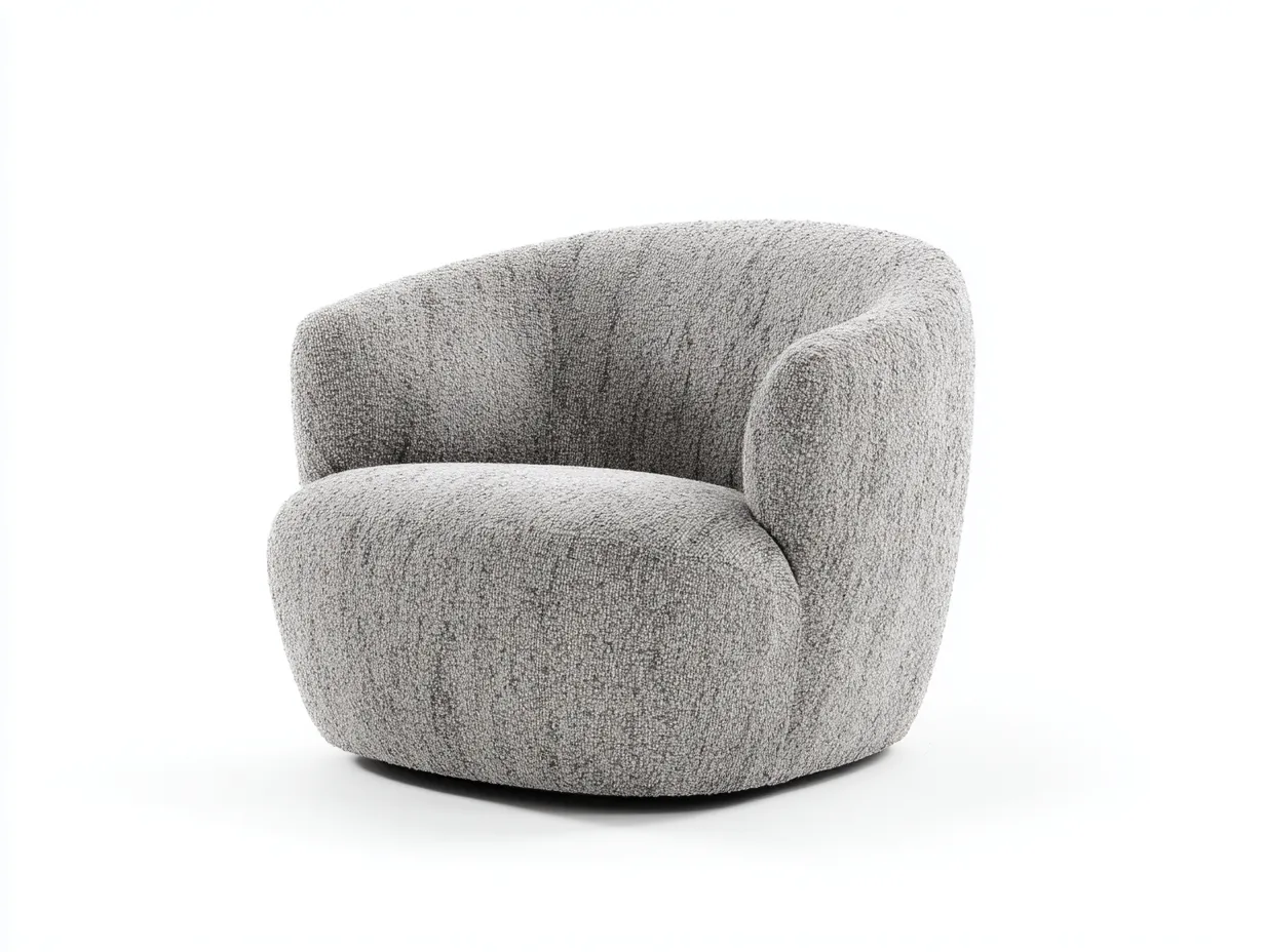 Este sillón de tela bouclé gris claro aporta al salón una presencia serena, acogedora y muy actual. Su diseño redondeado crea una silueta continua y envolvente que suaviza visualmente el espacio, mientras que el asiento amplio favorece una experiencia de uso cómoda y relajada. Gracias a sus proporciones equilibradas y a su aspecto compacto, este modelo funciona muy bien como sillón auxiliar, asiento de lectura o pieza decorativa en una zona de estar contemporánea.