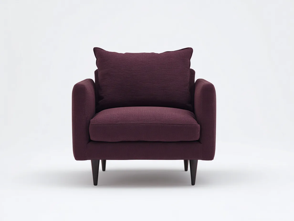 Este sillón de tela burdeos aporta al salón una presencia cálida, acogedora y muy equilibrada, ideal para crear un rincón de descanso con personalidad. Su diseño combina brazos rectos, asiento amplio y un gran cojín de respaldo que refuerza la sensación de confort desde el primer uso. El tono burdeos añade profundidad visual y una nota elegante que se integra con facilidad en ambientes contemporáneos, sobrios o ligeramente clásicos. Las patas de madera oscura elevan visualmente el conjunto y aportan una base más ligera, mientras que la proporción compacta permite colocarlo junto a un sofá, una mesa auxiliar o en una zona de lectura. Gracias a su composición sencilla y a su imagen envolvente, este modelo funciona como una pieza funcional y decorativa dentro del salón.