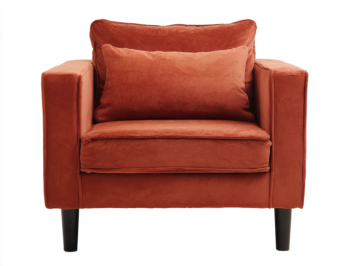 Este sillón de terciopelo rojo teja aporta al salón una presencia envolvente, elegante y muy acogedora, ideal para crear un rincón de descanso con carácter. Su diseño combina brazos rectos, un asiento profundo y dos cojines generosos que refuerzan inmediatamente la sensación de confort. El tono rojo teja añade calidez visual y una nota sofisticada que combina con facilidad con madera oscura. El terciopelo suaviza el conjunto con una textura rica y cambiante según la luz, mientras que las patas negras aportan contraste y equilibrio visual. Gracias a sus proporciones compactas y a su estética sobria, este modelo se integra con naturalidad en un salón contemporáneo, elegante o de inspiración cálida y refinada.