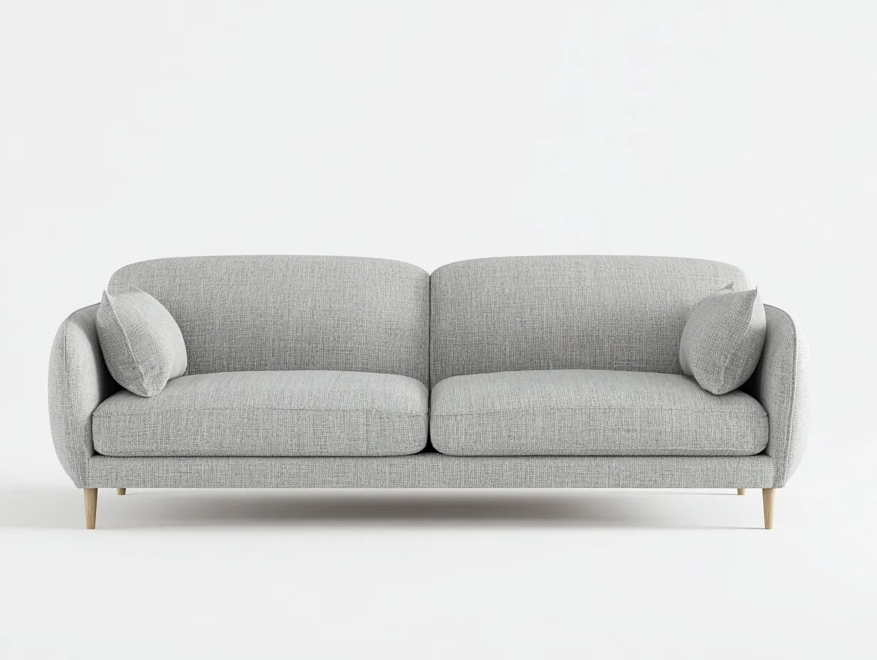 La estructura está revestida en tejido gris claro con textura fina, pensado para ofrecer una apariencia uniforme, agradable y fácil de integrar en diferentes estilos decorativos. Los cojines de asiento y respaldo presentan un acolchado generoso que favorece una sentada cómoda y estable. Las patas de madera clara proporcionan soporte firme, elevan visualmente el sofá y añaden un contraste natural que suaviza aún más la ligereza del tapizado.